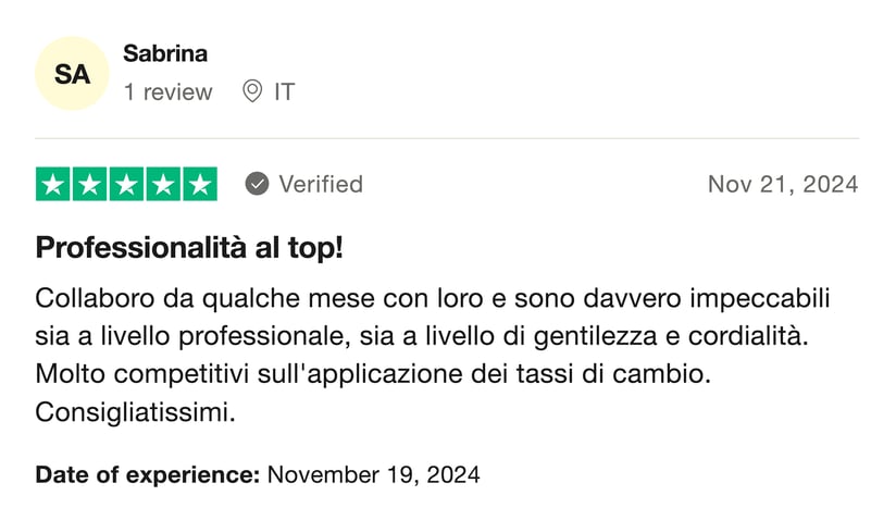 D’altro canto, iBanFirst è progettata per le piccole e medie imprese che hanno regolarmente a che fare con pagamenti internazionali e necessitano di un approccio più specializzato. Se la tua attività si dedica all’import-export, alla vendita all'ingrosso od opera in diversi Paesi, l’efficiente piattaforma di iBanFirst, unitamente al supporto di specialisti valutari, vi offre un vantaggio significativo. Grazie a un piano commissionale trasparente e a consumo e a un’assistenza personalizzata, iBanFirst garantisce che la vostra attività abbia a sua disposizione le competenze e gli strumenti necessari per esplorare le complessità delle transazioni transfrontaliere.