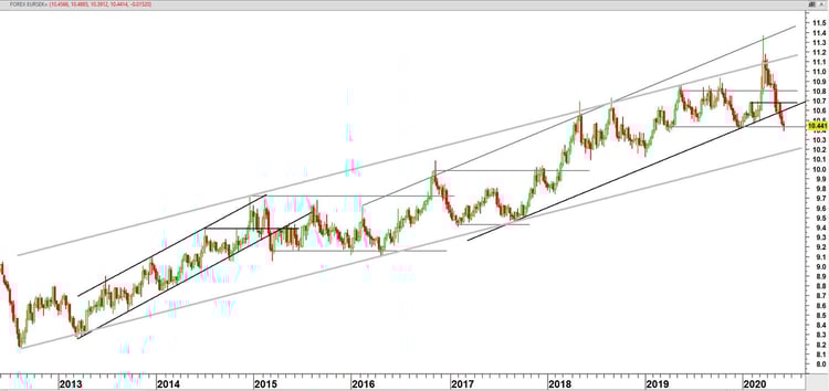 De meerjarige langetermijn trend van de euro tegenover de Zweedse kroon is intact. Onder EUR/SEK 10,40 komt de onderkant van het stijgende trendkanaal rond EUR/SEK 10,20 in beeld
